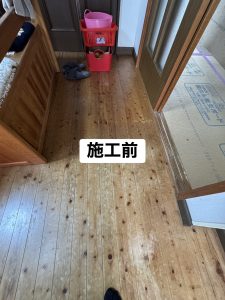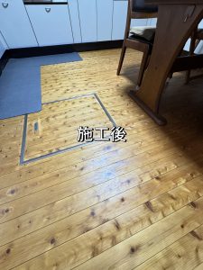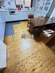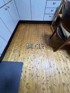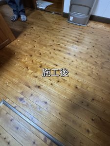 LDKの床のシミも電動ペーパーで削ってクリア塗装を2回塗りすれば綺麗になります✨